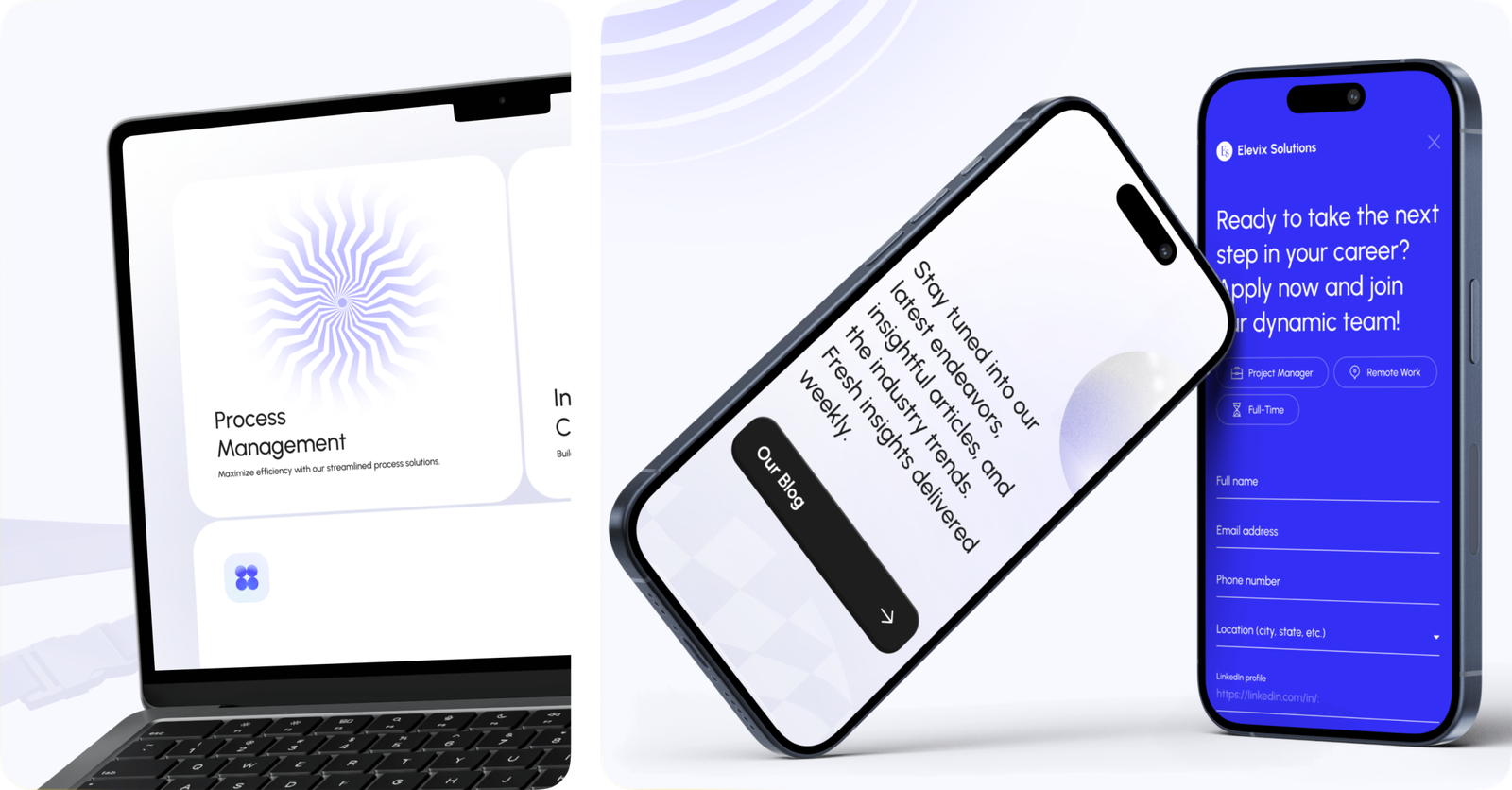 Elevix Solutions approached us with the vision of creating a website that highlights their unique capabilities in providing tailored business solutions. The primary objective was to design a user-friendly, innovative website that would not only showcase Elevix’s technical expertise but also facilitate easy communication with potential clients. The website needed to serve as a hub for outsourcing services, with seamless access to their in-house projects and solutions. Furthermore, it had to reflect the company’s commitment to cutting-edge technologies, sustainable automation, and Al-powered innovations.
