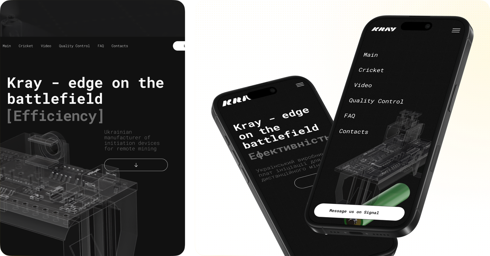 Kray is a Ukrainian tech manufacturer specializing in smart initiation boards for remote mining via drones. Their flagship product, “Tsvirkun”, is a next-gen smart board that reacts to magnetic field distortions to detect enemy vehicles. We were tasked with creating a complete digital presence that matches the innovation and tactical nature of the product.