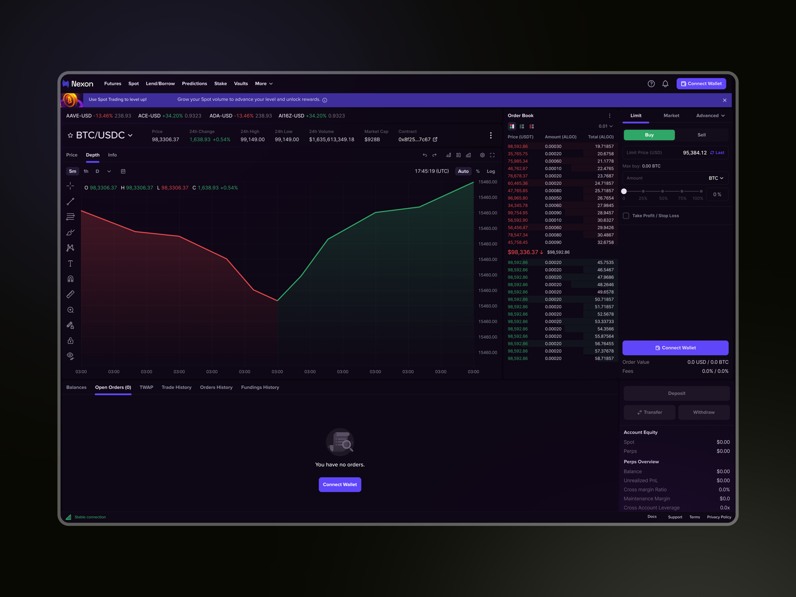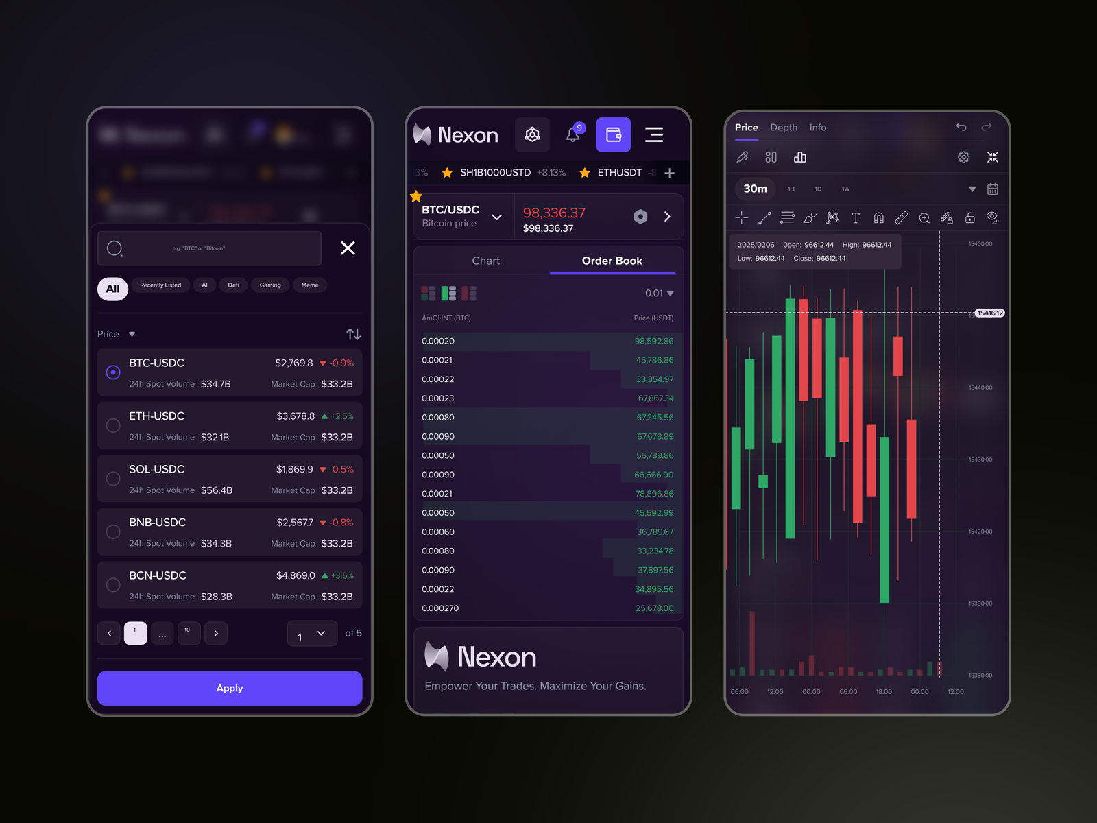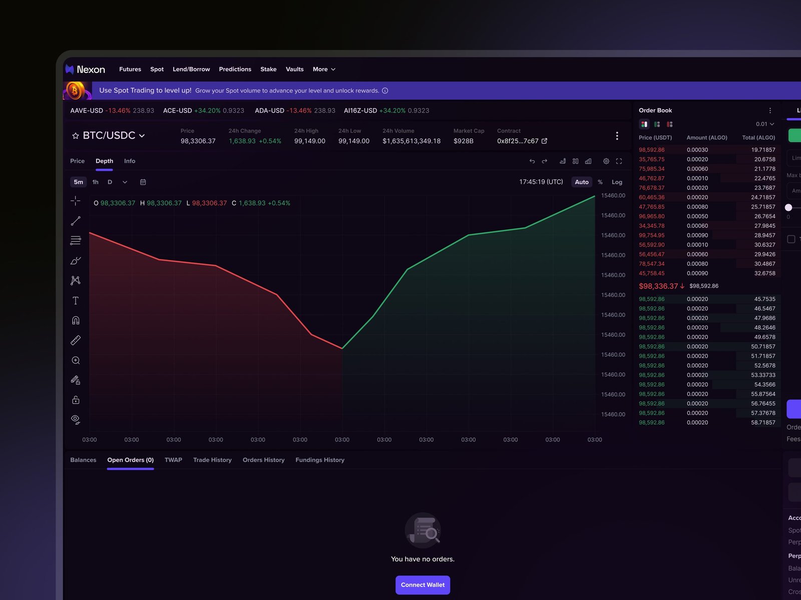 Nexon combines real-time order book depth, advanced charting tools, and seamless wallet integration into a sleek, responsive Web3 interface.