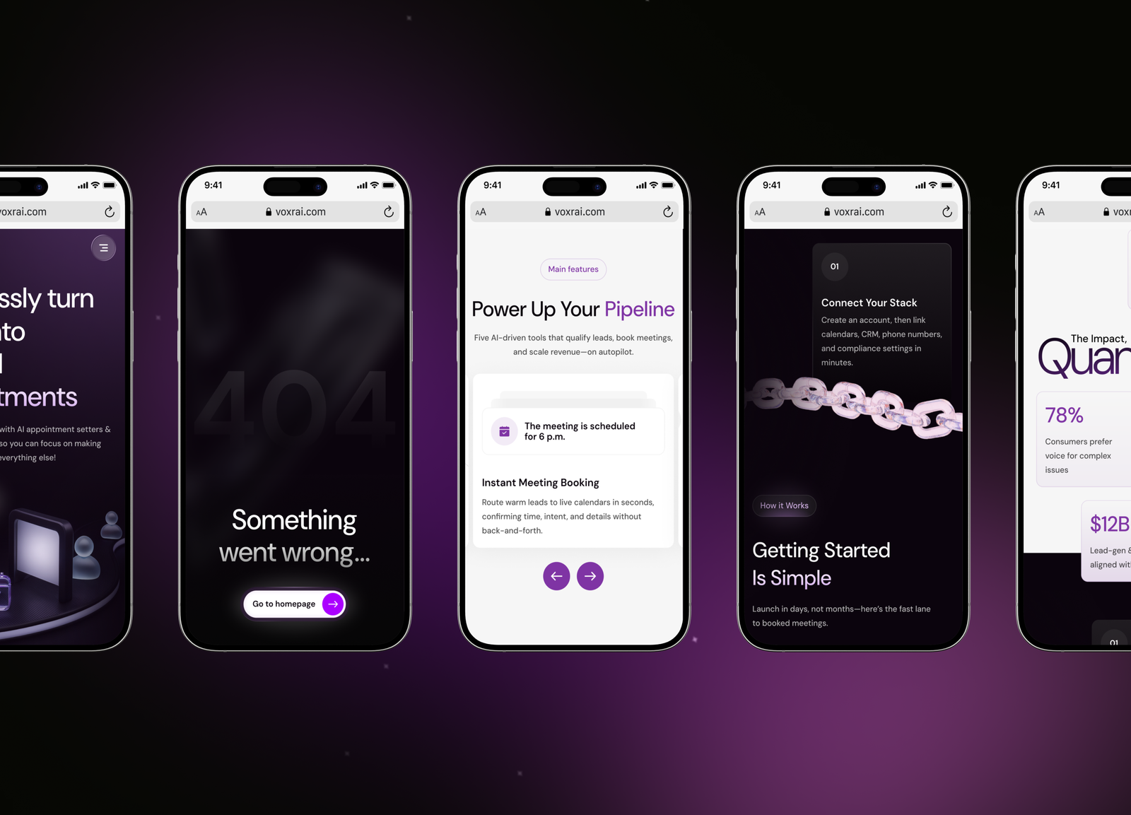We built a cohesive UI system with strong typography, clear hierarchy, and smooth animations. The interface supports readability in dark mode, highlights key actions, and visually reinforces VOXR’s positioning as a powerful yet elegant AI sales solution.