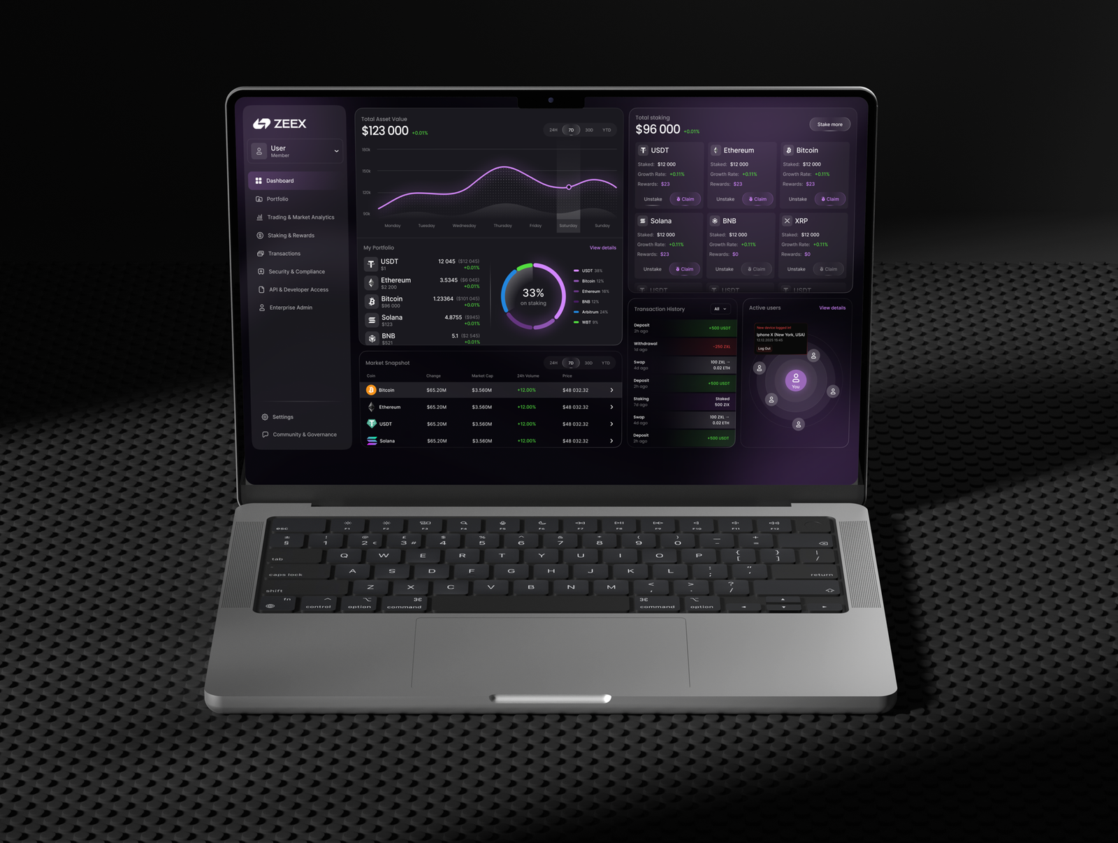 We built a scalable UI system for charts, tables, badges, and states, optimized for dark mode. The final design ensures consistent components, clear hierarchy, and smooth interaction across portfolio, analytics, and staking sections.
